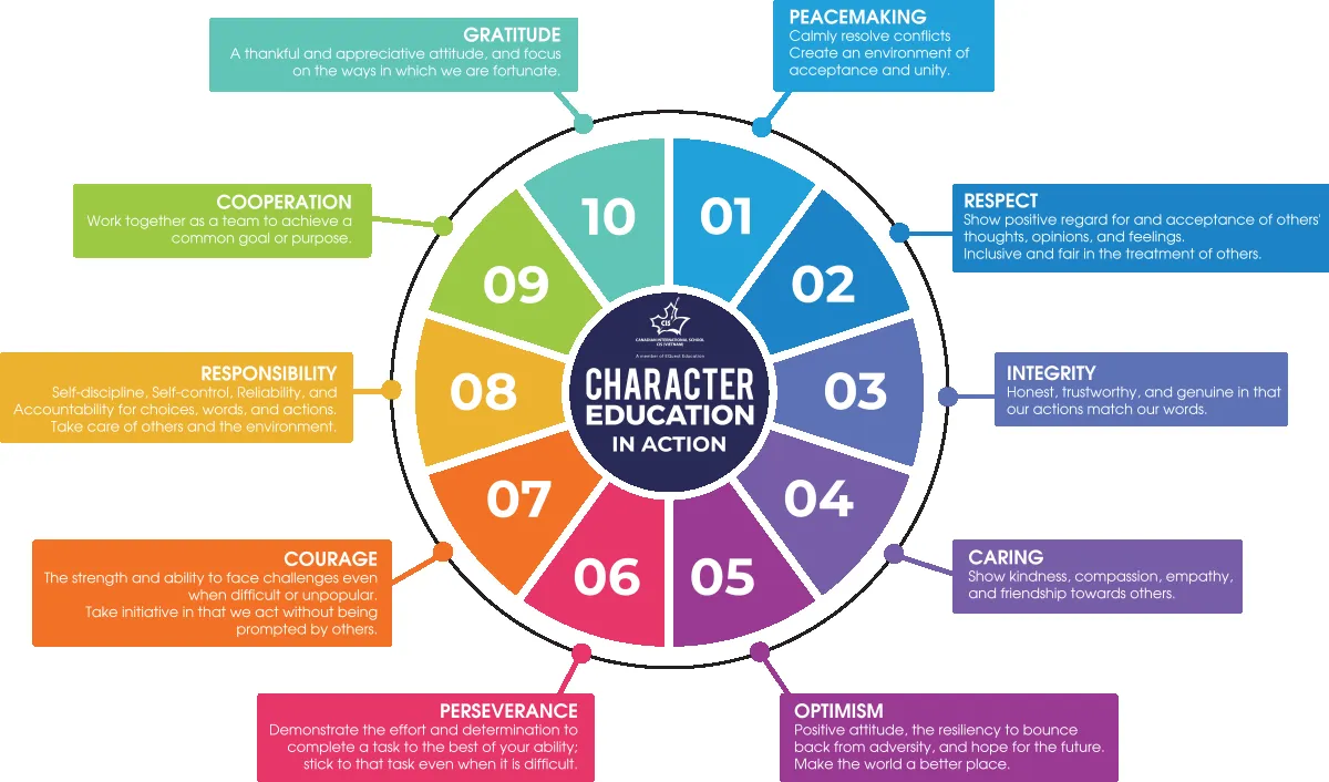 The Canadian International School – Vietnam ist eine integrative Gemeinschaft, die der Entwicklung zukünftiger Führungspersönlichkeiten verpflichtet ist. Aufgebaut auf akademischen Leistungen, Service-Learning, globalem Bürgertum, forschendem Lernen, Reflexion und der Balance von Geist und Körper, fordert sie alle Mitglieder ihrer Gemeinschaft heraus, aktive, lebenslange Lernende zu sein.