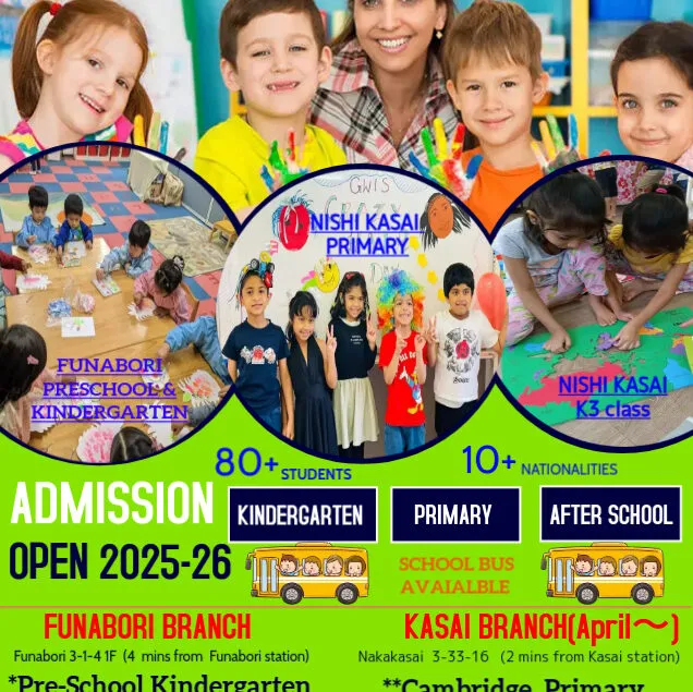Global Wisdom International School est une école internationale établie et réputée à Tokyo (Edogawa), proposant un programme international complet pour la maternelle et l'école primaire. Le campus de Funabori est une crèche et un jardin d'enfants principalement basé sur le programme Montessori. Le campus de Nishi-Kasai propose le Cambridge Primary Curriculum pour les niveaux 1 à 3. Tous les enseignants sont hautement expérimentés, qualifiés et formés dans leurs domaines respectifs.