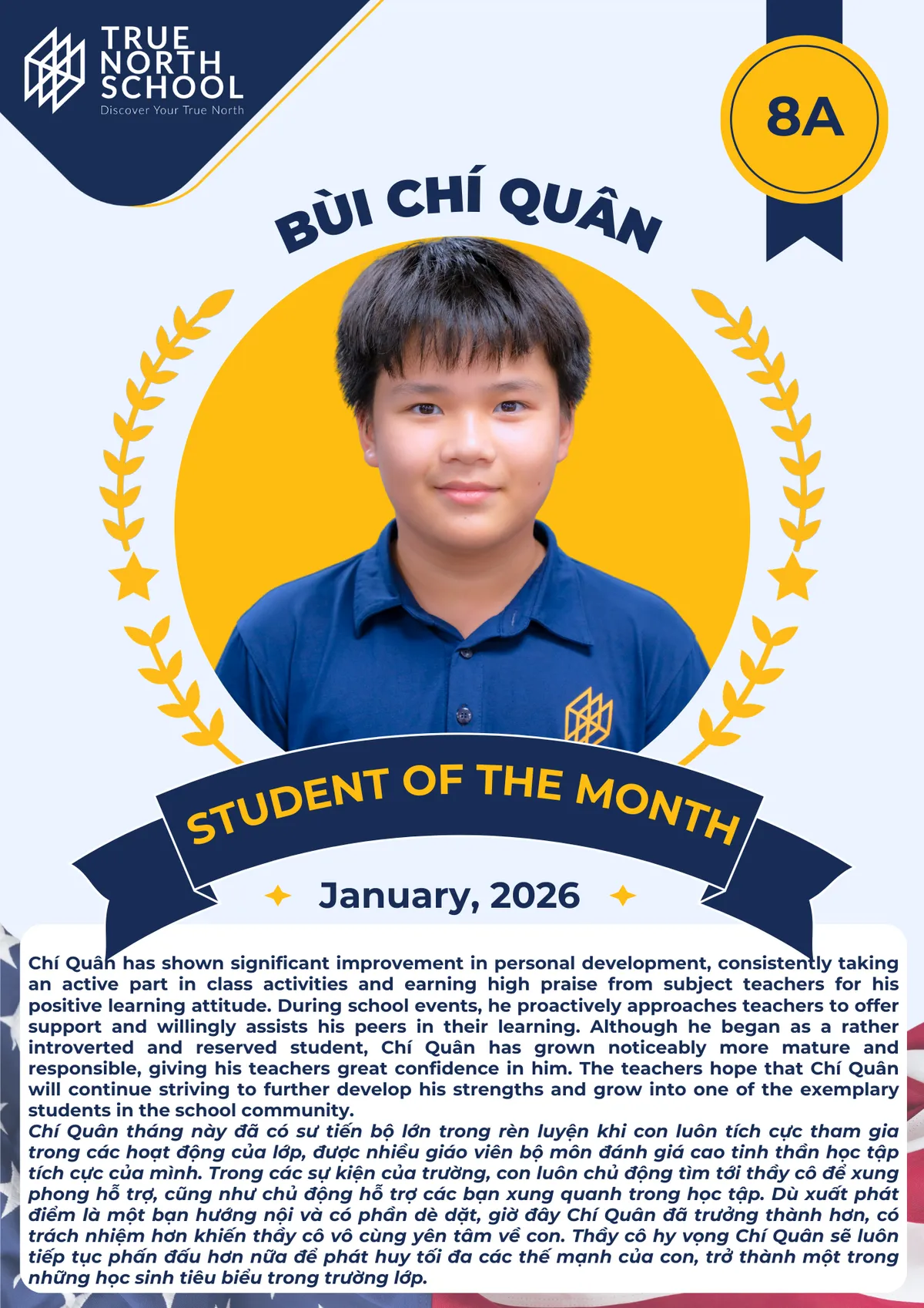 True North School est un établissement d'enseignement pour les classes K-12 dédié à accompagner les élèves dans la découverte de leur True North à travers quatre piliers d'excellence : le Développement du Caractère, la Rigueur Académique, la Citoyenneté Mondiale et le Bien-être.